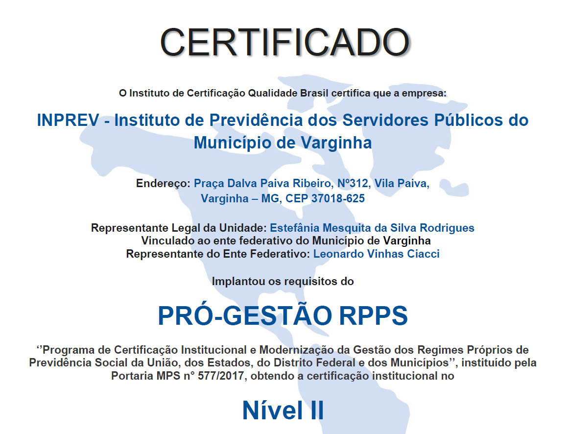 O Instituto de Previdência dos Servidores Públicos de Varginha – INPREV recebeu a recertificação no nível de aderência II no Programa de Certificação Institucional e Modernização da Gestão dos Regimes Próprios de Previdência Social – Pró-Gestão RPPS.